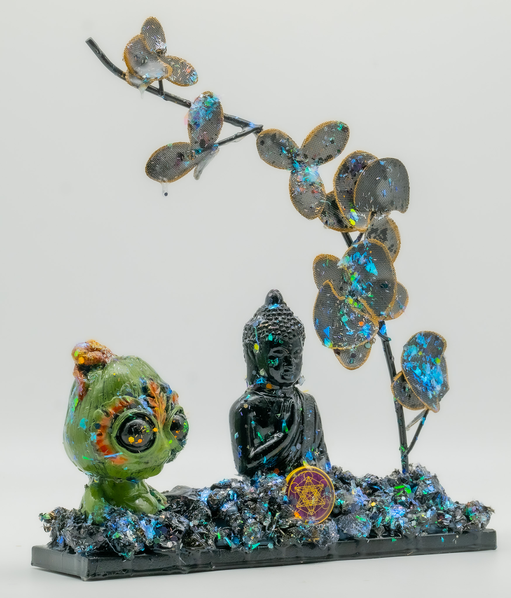 Neben ihm steht das Alien – staunend, offen und voller Begeisterung. Es beobachtet den Buddha mit ehrlicher Neugier und spürbarem Respekt. Während der Buddha einfach ist, lernt das Alien allein durch das Dasein des anderen. Worte sind nicht nötig. Weisheit entsteht hier durch Beobachtung.