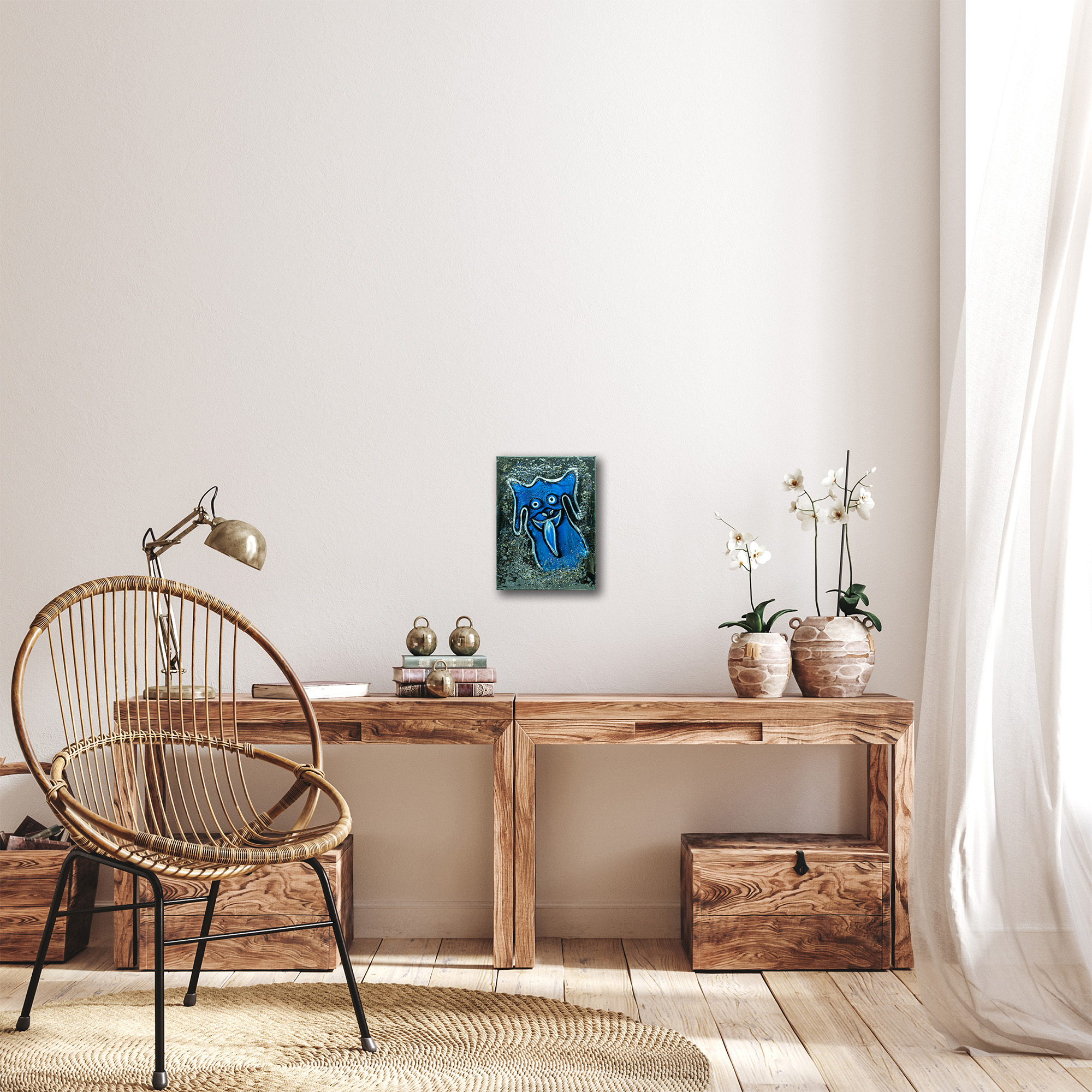 Amy der Hund blickt mit übergroßen Augen aus der Dunkelheit – zu freundlich, um harmlos zu sein. Das tiefe Blau ihres Körpers scheint lebendig zu pulsieren, als würde unter der glänzenden Oberfläche etwas lauern. Ihr übertriebener Ausdruck und die heraushängende Zunge verleihen ihr eine groteske Komik, die den Betrachter zugleich schmunzeln und frösteln lässt.