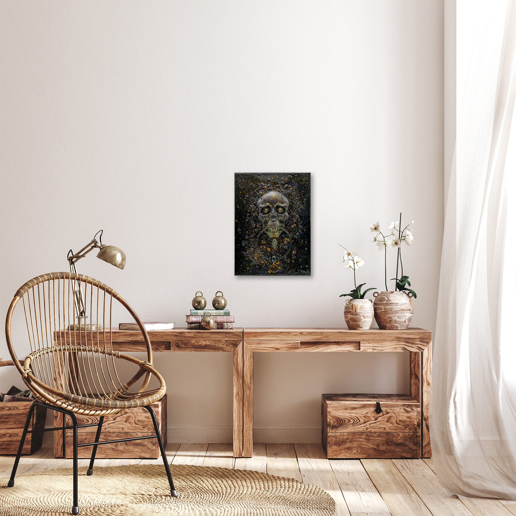 Das Tor zur Unterwelt erinnert an die düstere Pracht alter Legenden – ein Kunstwerk, das direkt aus den Hallen Draculas stammen könnte. Der silberne Totenschädel erhebt sich aus einem Meer geschmolzener Schatten, seine Oberfläche von glitzernden Kristallfragmenten durchzogen wie von erstarrtem Sternenstaub.