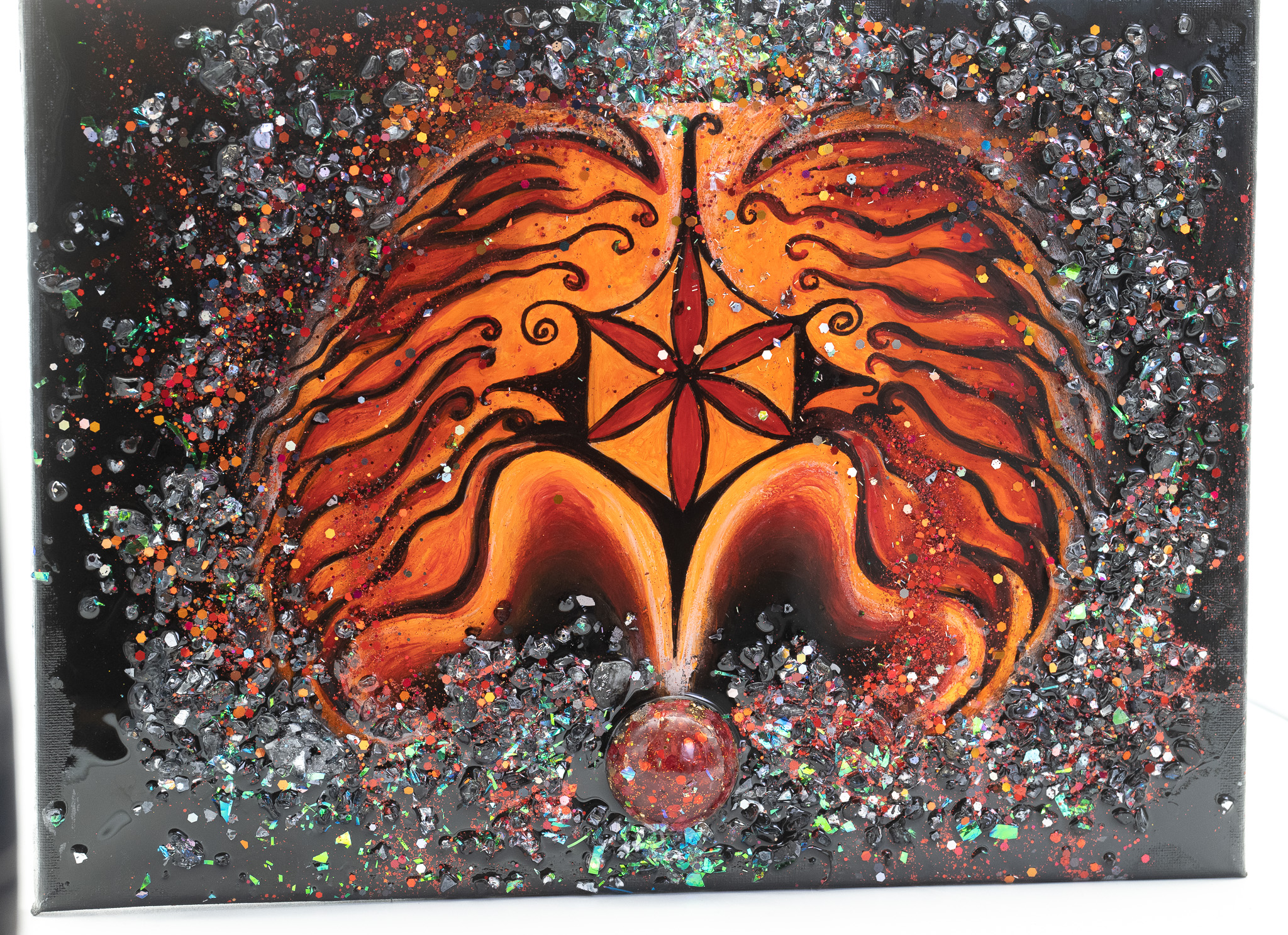 Verarbeitet sind gefärbte Kristalle sowie ein Orgonit-Wurzelchakra-Stein, eingebettet in eine vielschichtige Struktur. Die Oberfläche ist reich an Textur, Lichtpunkten und Kontrasten, wodurch das Werk je nach Blickwinkel immer neue Details offenbart. Besonderes Merkmal: Das flammende Feuer ist vollständig von Hand mit Acryl gemalt, was dem Objekt eine spürbare Tiefe und künstlerische Eigenständigkeit verleiht.