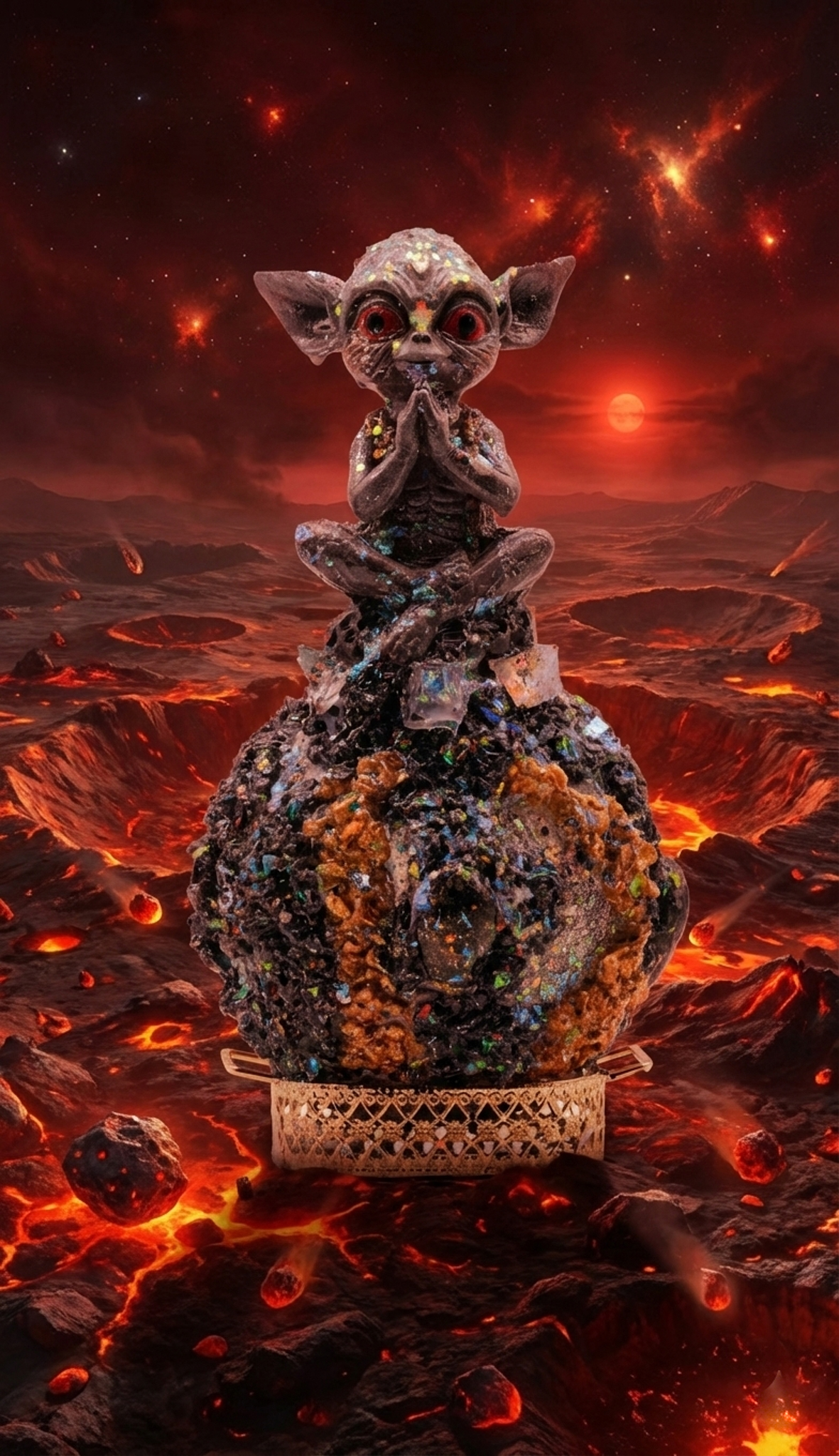Diese Skulptur zeigt einen kleinen Gnom, der ruhig auf seinem kugelförmigen Kristallthron sitzt.
