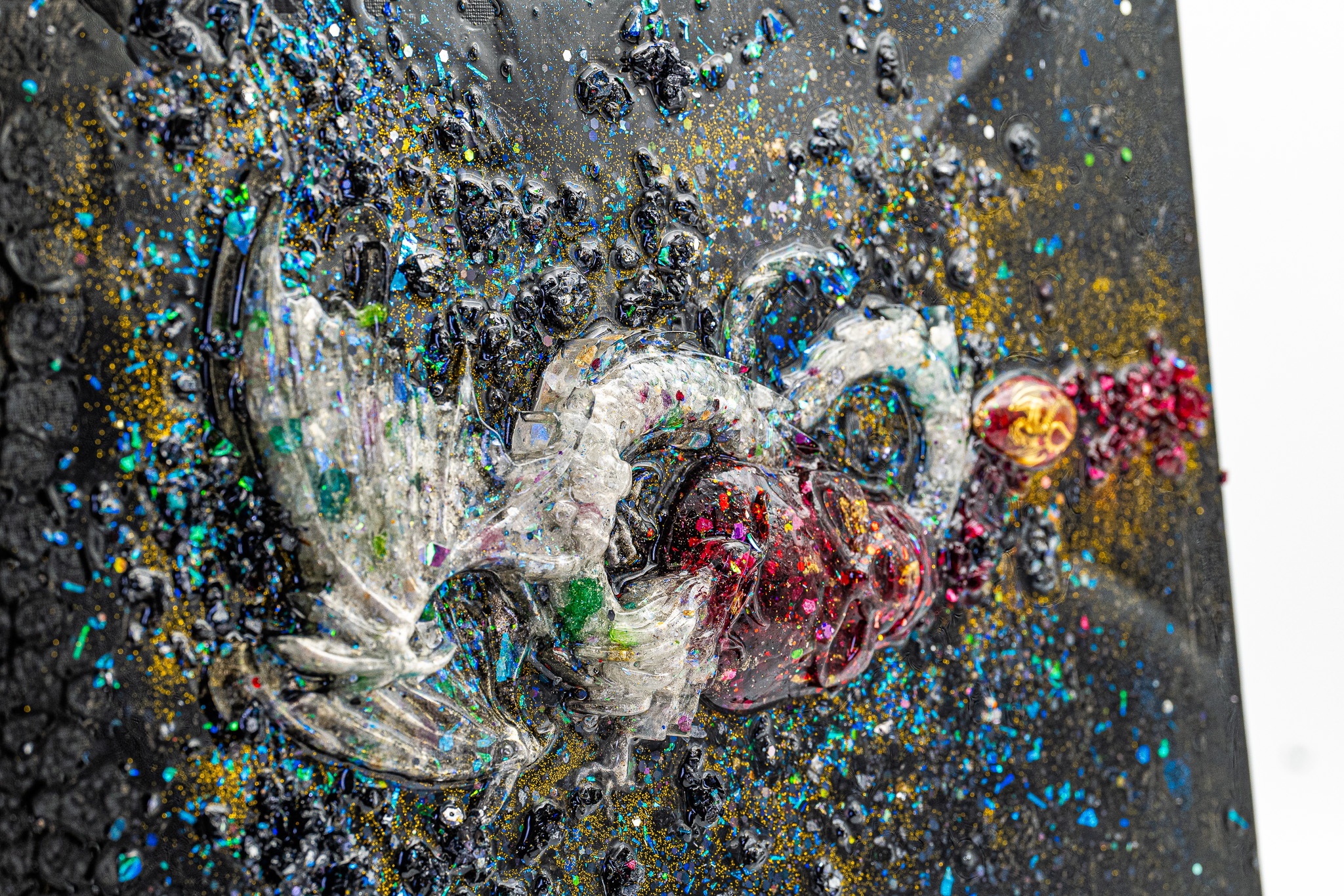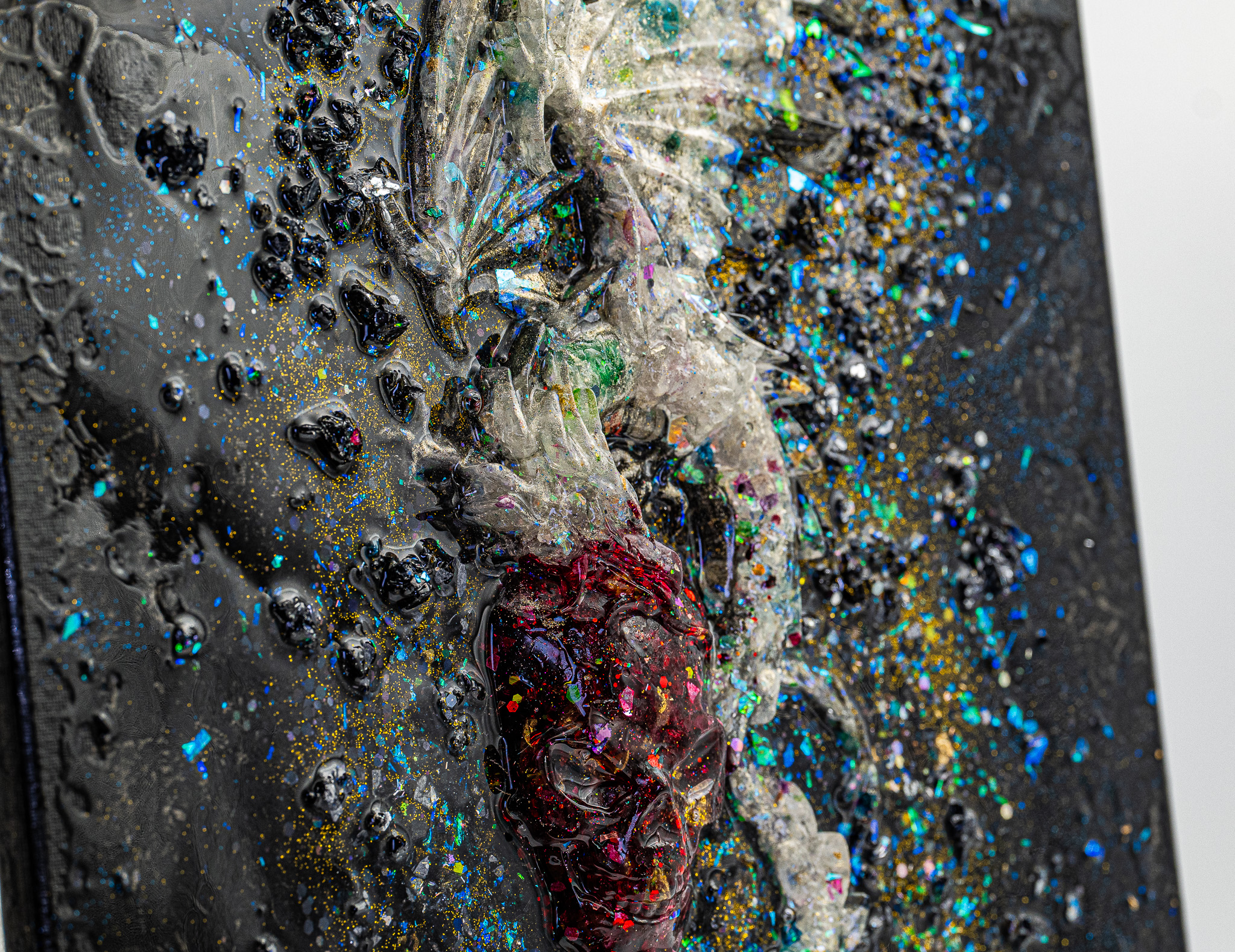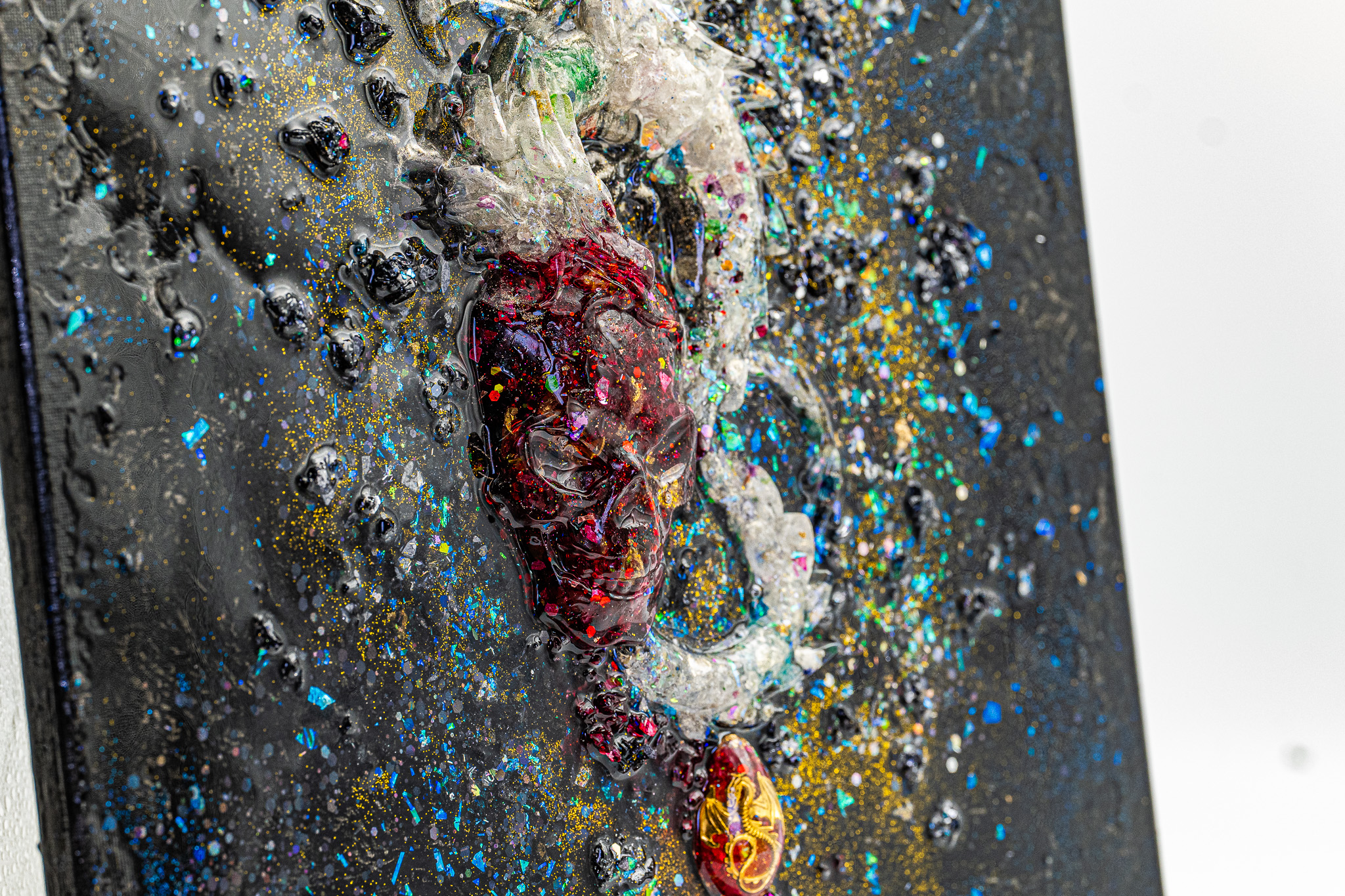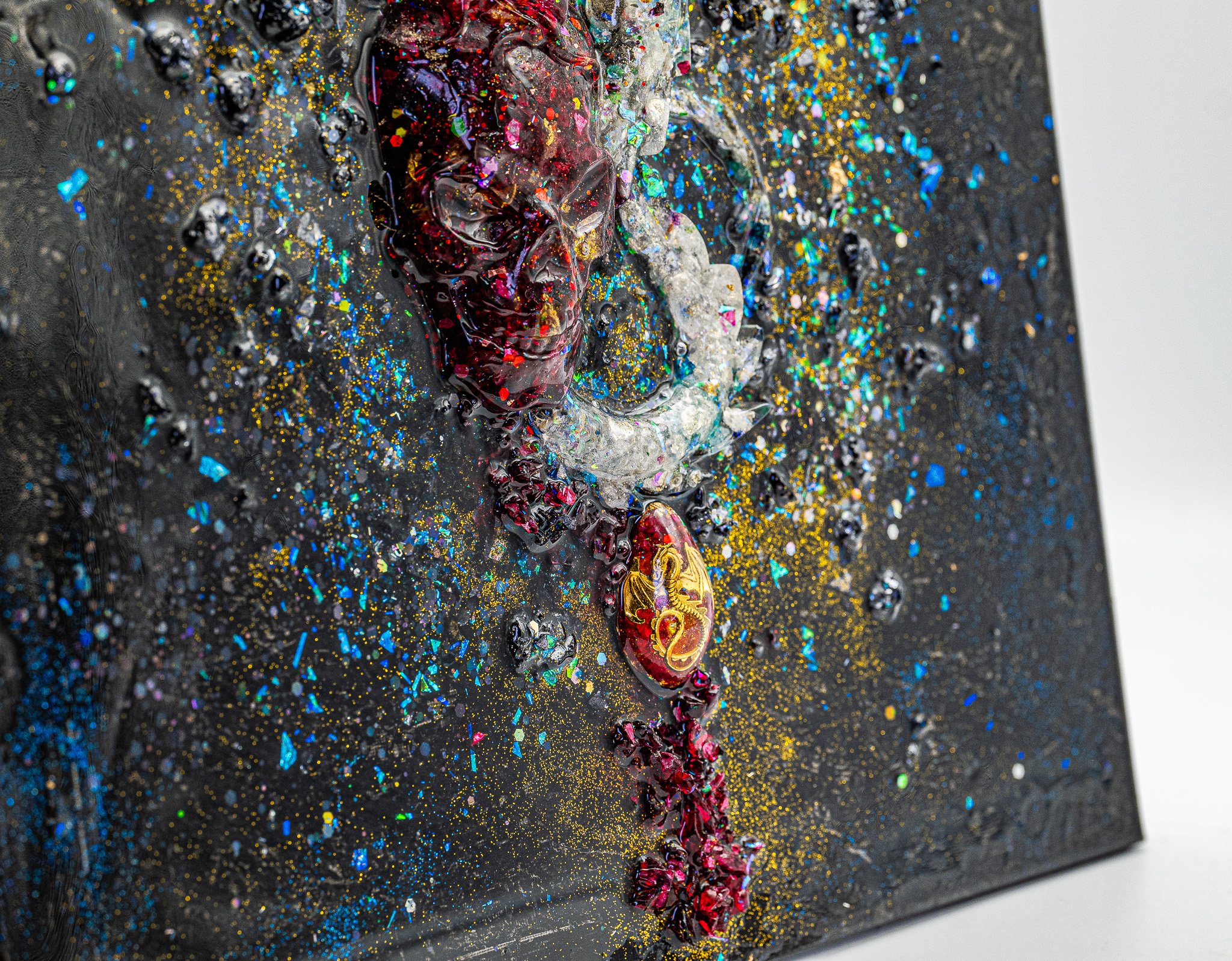 Im Zentrum des Werkes befindet sich ein Orgonit-Pranatropfen, der wie ein energetischer Kern wirkt – als Herzpunkt des Drachen. Umgeben von gefärbten Bergkristallen, die Licht reflektieren und brechen, entsteht eine lebendige Oberfläche mit starkem haptischem und visuellem Ausdruck. Die Acrylfarbe verbindet alle Elemente zu einer dichten, fast alchemistischen Komposition.