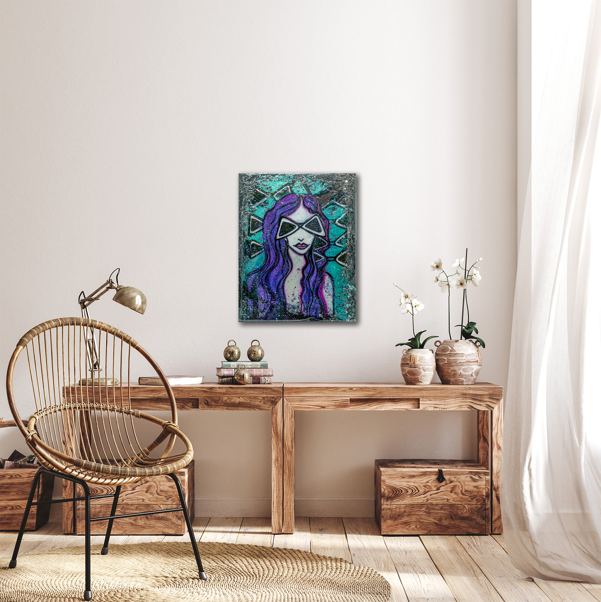 Jane from the Deep blickt den Betrachter mit einer Ruhe an, die mehr verbirgt als sie zeigt. Ihr violettes Haar scheint sich wie flüssiger Schatten über den türkisfarbenen Hintergrund zu ergießen – ein Bild zwischen Schönheit und Verderbnis. Einst eine Jägerin der Dunkelheit, ließ sie sich vom Flüstern der Tiefe verführen und wurde selbst Teil dessen, was sie bekämpfte.