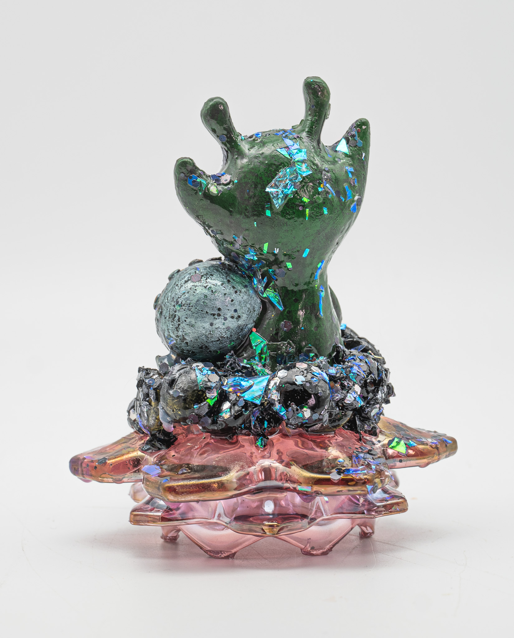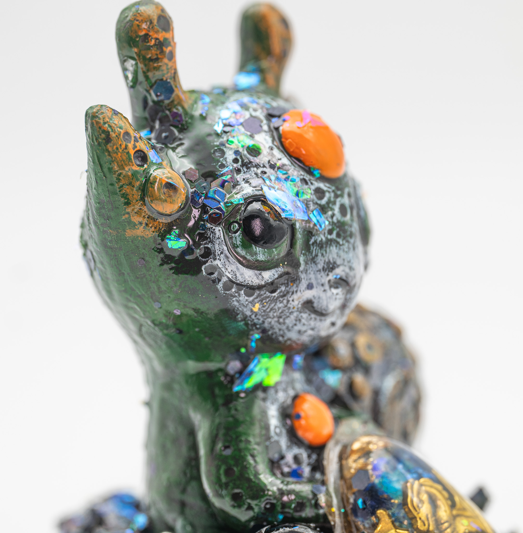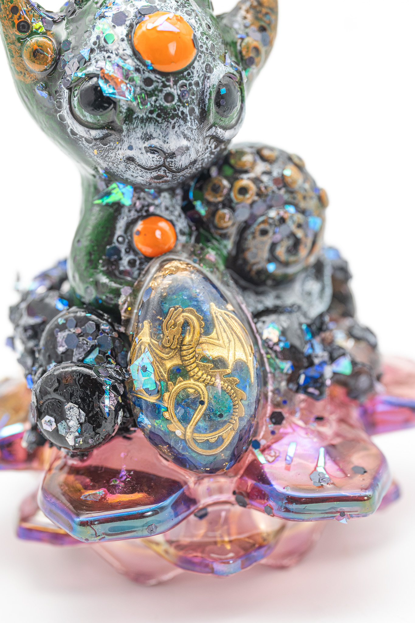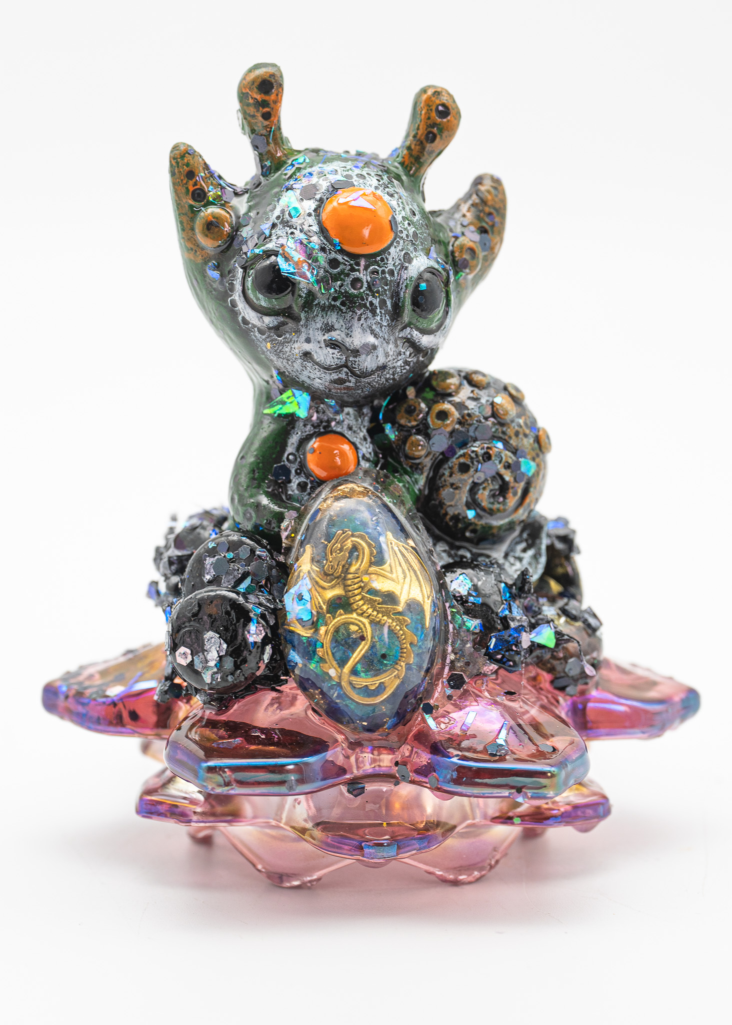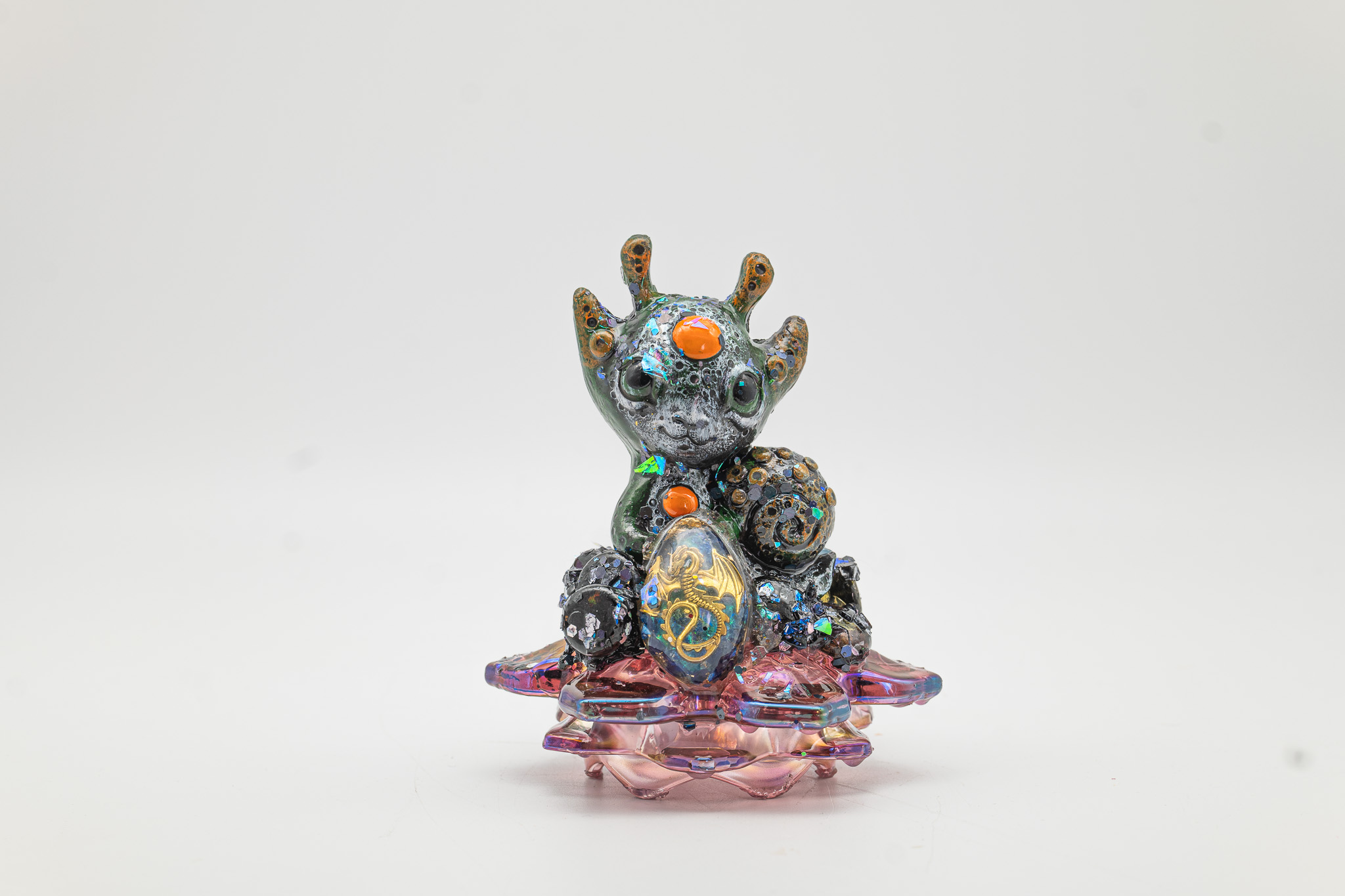 Sein Körper trägt organische Strukturen, Spiralen und schimmernde Einschlüsse – als wäre er aus einer anderen Dimension gewachsen. Im Zentrum ruht ein gold-blauer Pranatropfen, eingebettet wie ein lebendiger Kern. Er symbolisiert Bewusstsein, Energiefluss und Transformation.