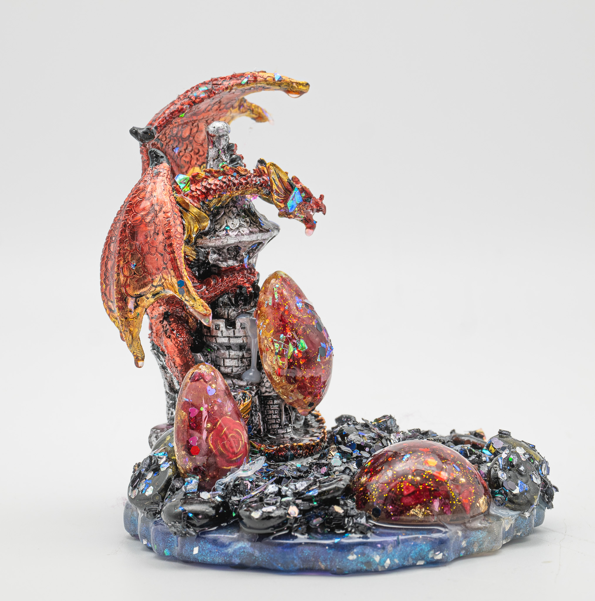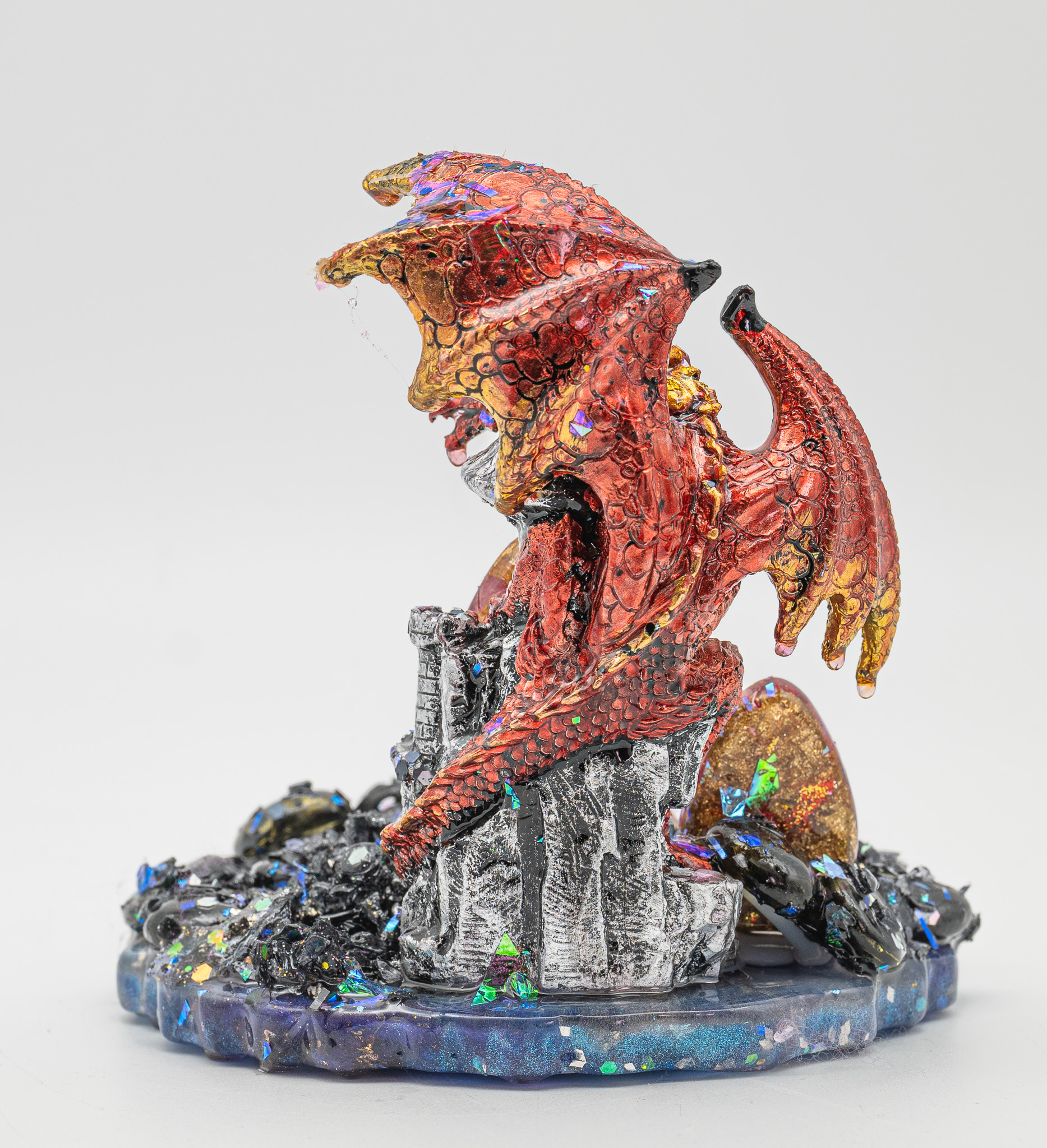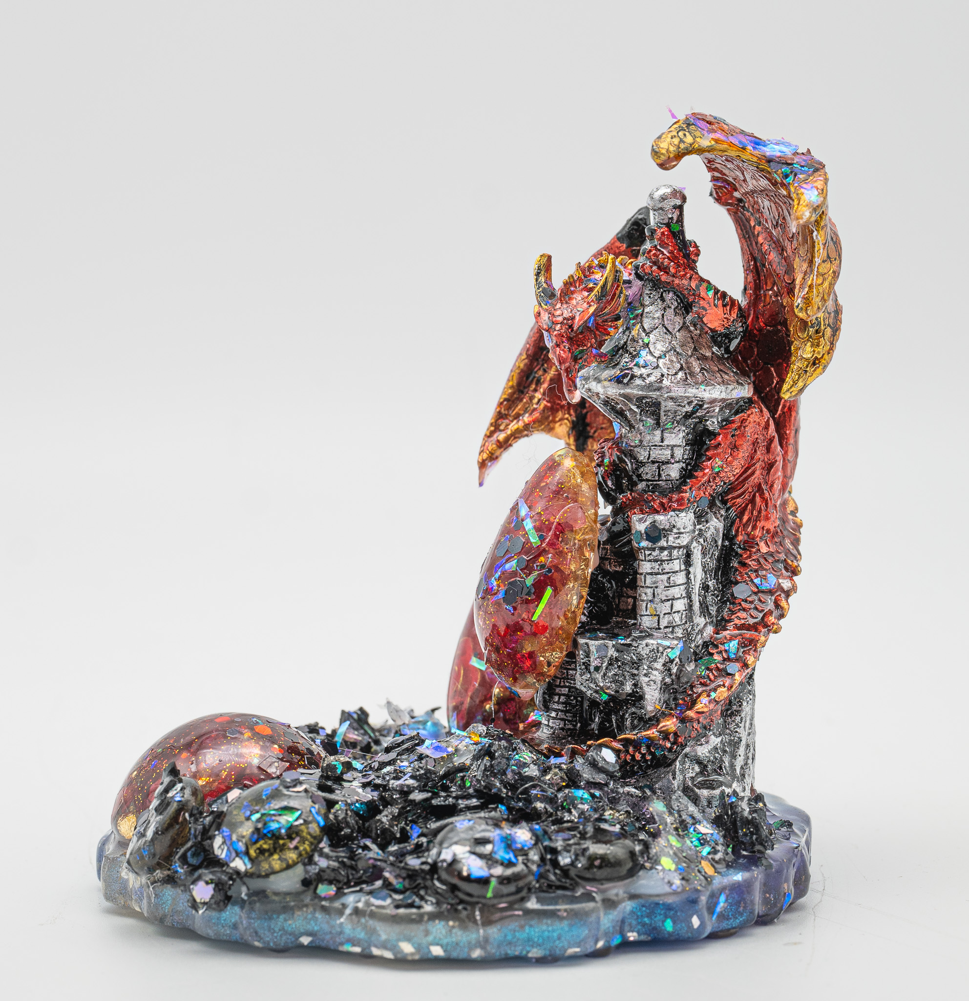 Der Orgonitsockel mit seinen metallischen Einschlüsse wirkt wie ein mystischer Boden aus Kristall und Lava – als wäre der Drache aus einer anderen Welt aufgestiegen.
