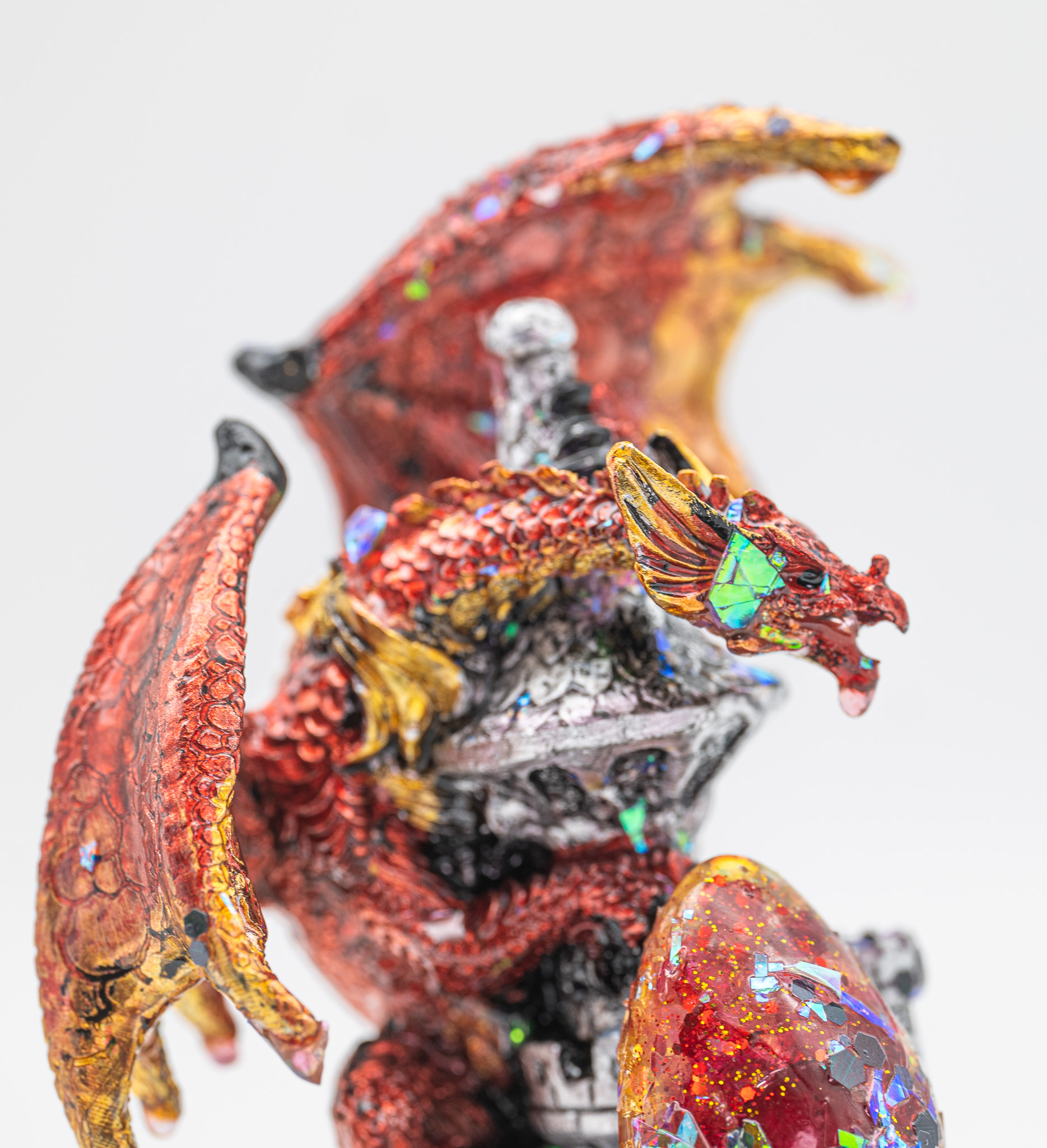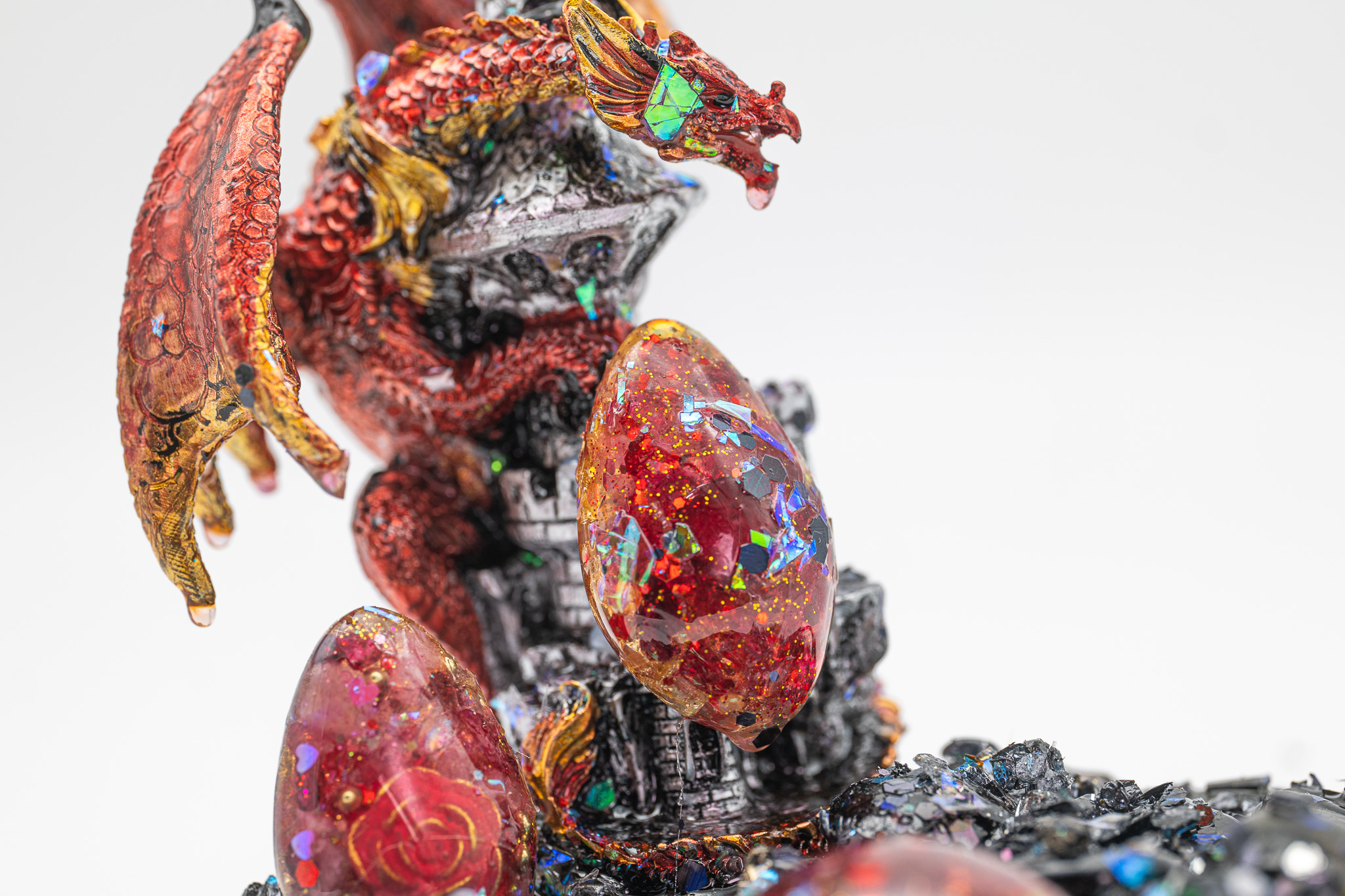 Je nach Lichteinfall entstehen reflektierende Farbspiele in den Tropfen und auf den Drachenflügeln.