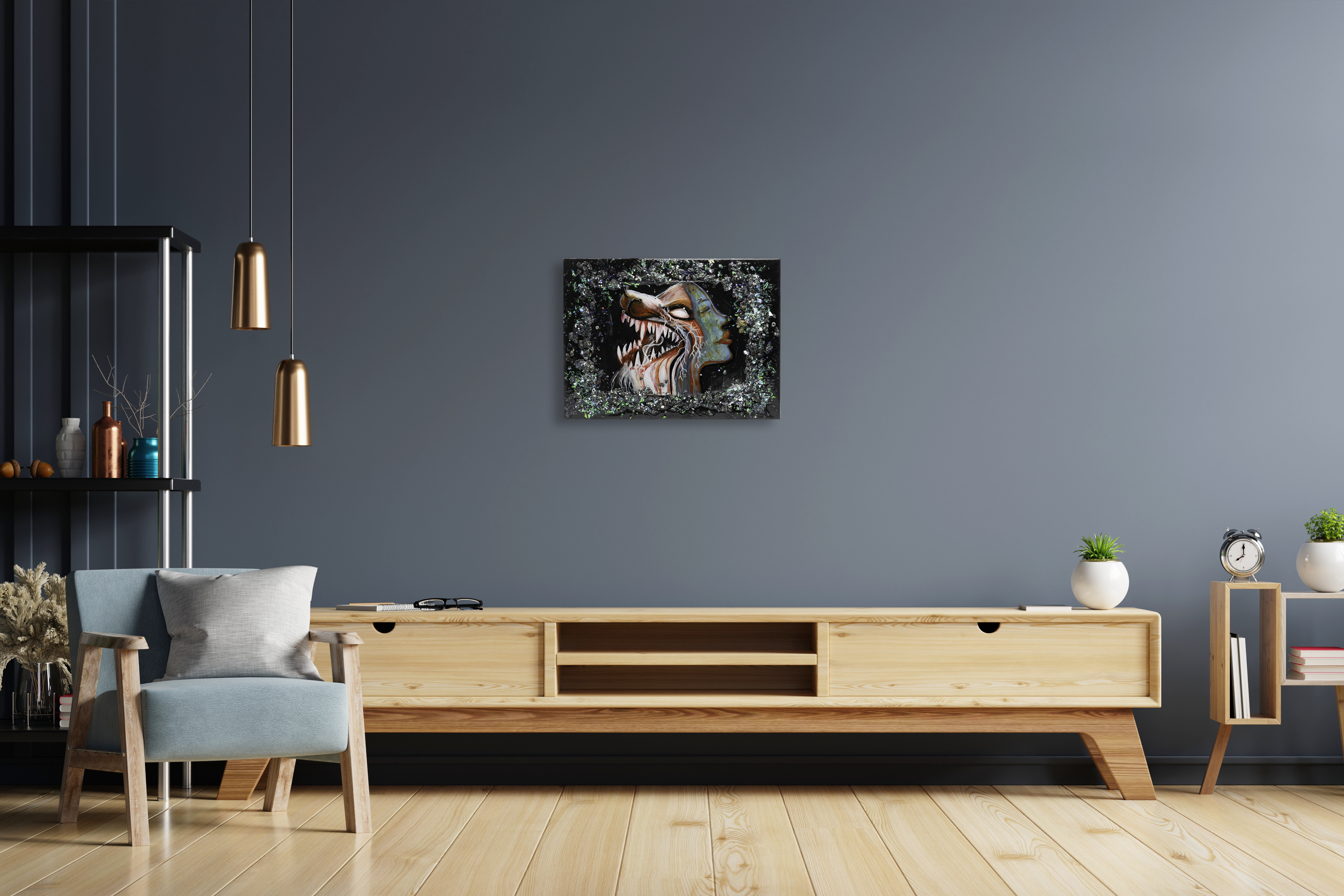 Die Komposition spielt mit Kontrasten: Sanfte, fließende Linien der weiblichen Form treffen auf scharfkantige, aggressive Strukturen des Monsters. Feine weiße Verästelungen verbinden beide Seiten wie ein neuronales Netz – ein Symbol für innere Verbundenheit, für unterdrückte Emotionen, für das, was unter der Oberfläche lebt.
