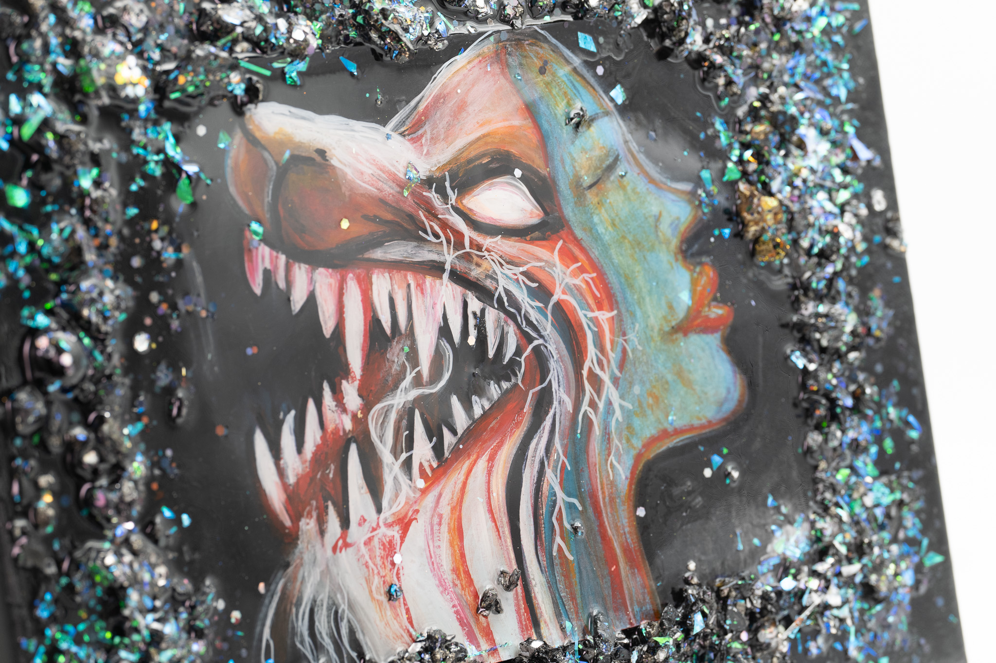 Der dunkle Hintergrund verstärkt die Intensität, während eingefasste, gefärbte Kristalle und strukturierte Elemente dem Werk zusätzliche Tiefe, Lichtreflexion und Dreidimensionalität verleihen. Je nach Lichteinfall entstehen neue Nuancen und Perspektiven.