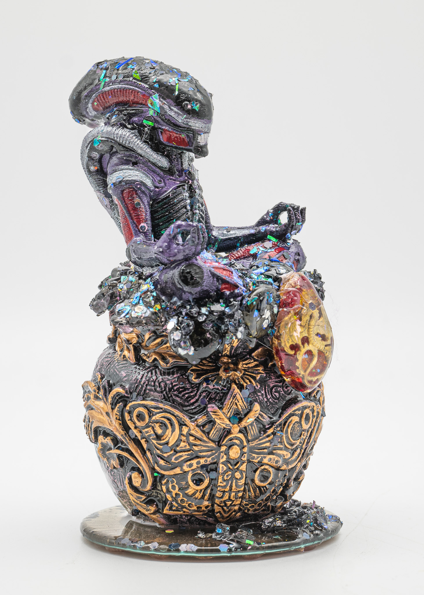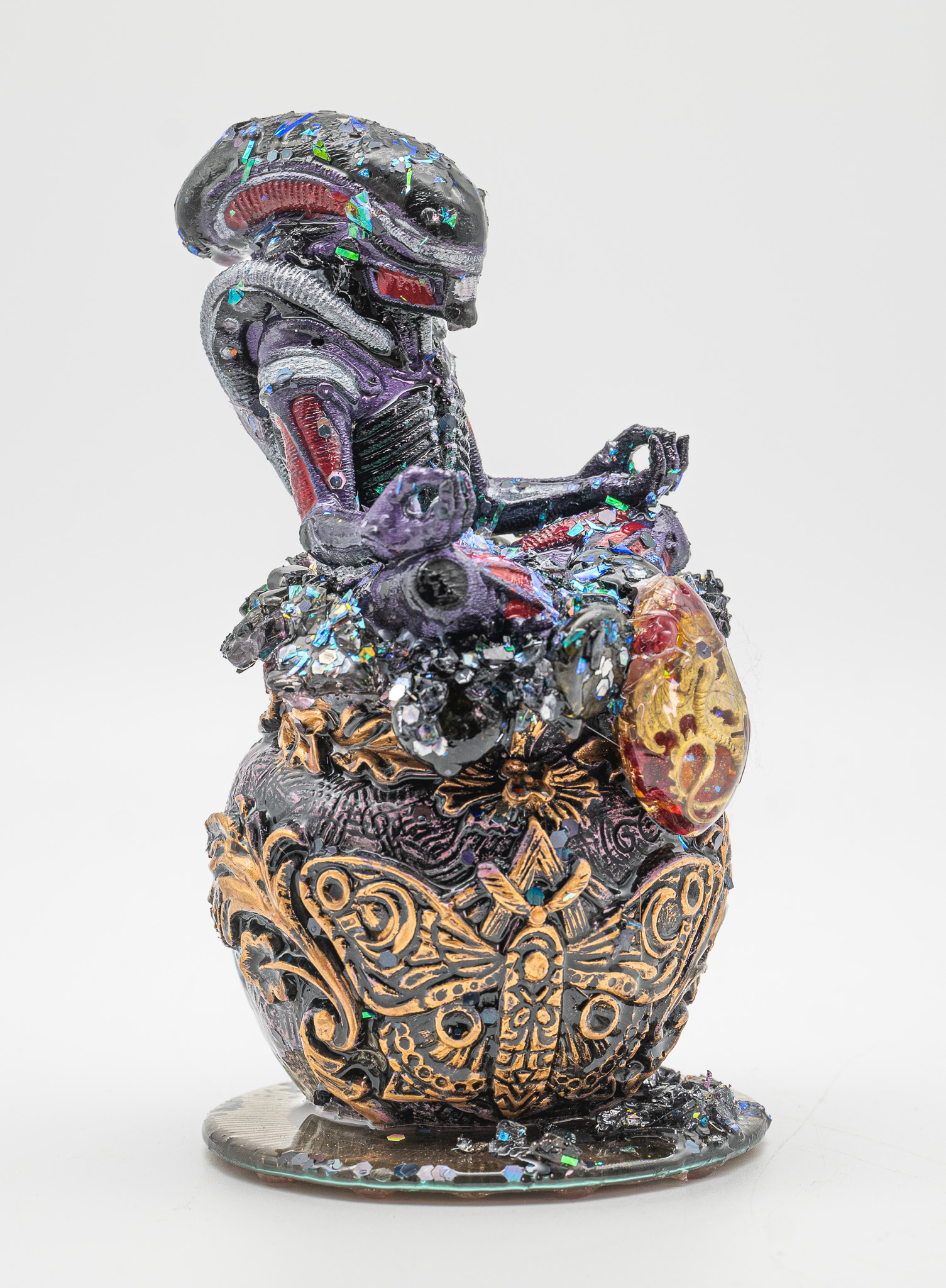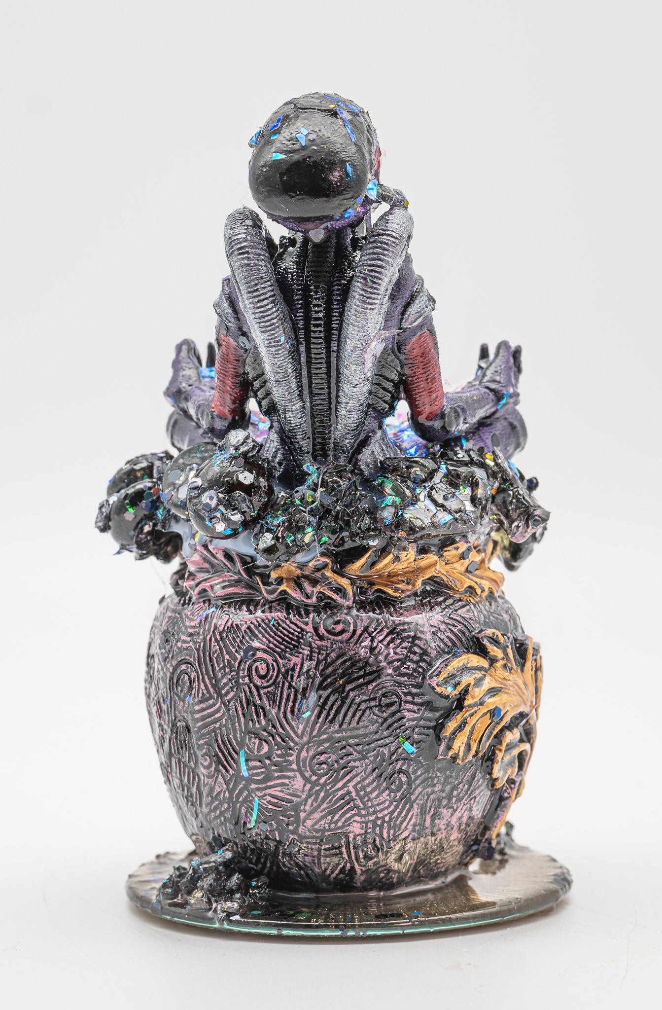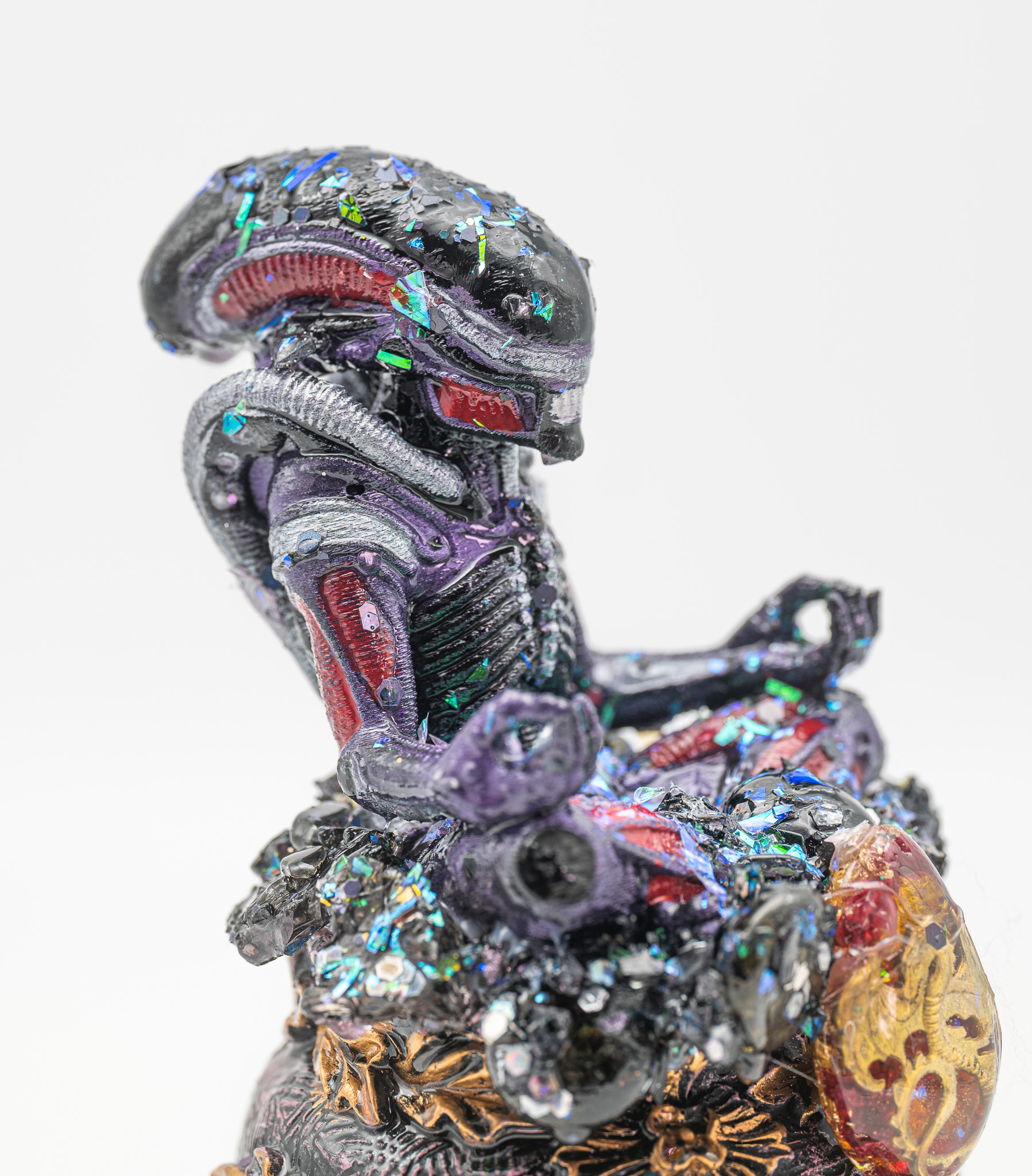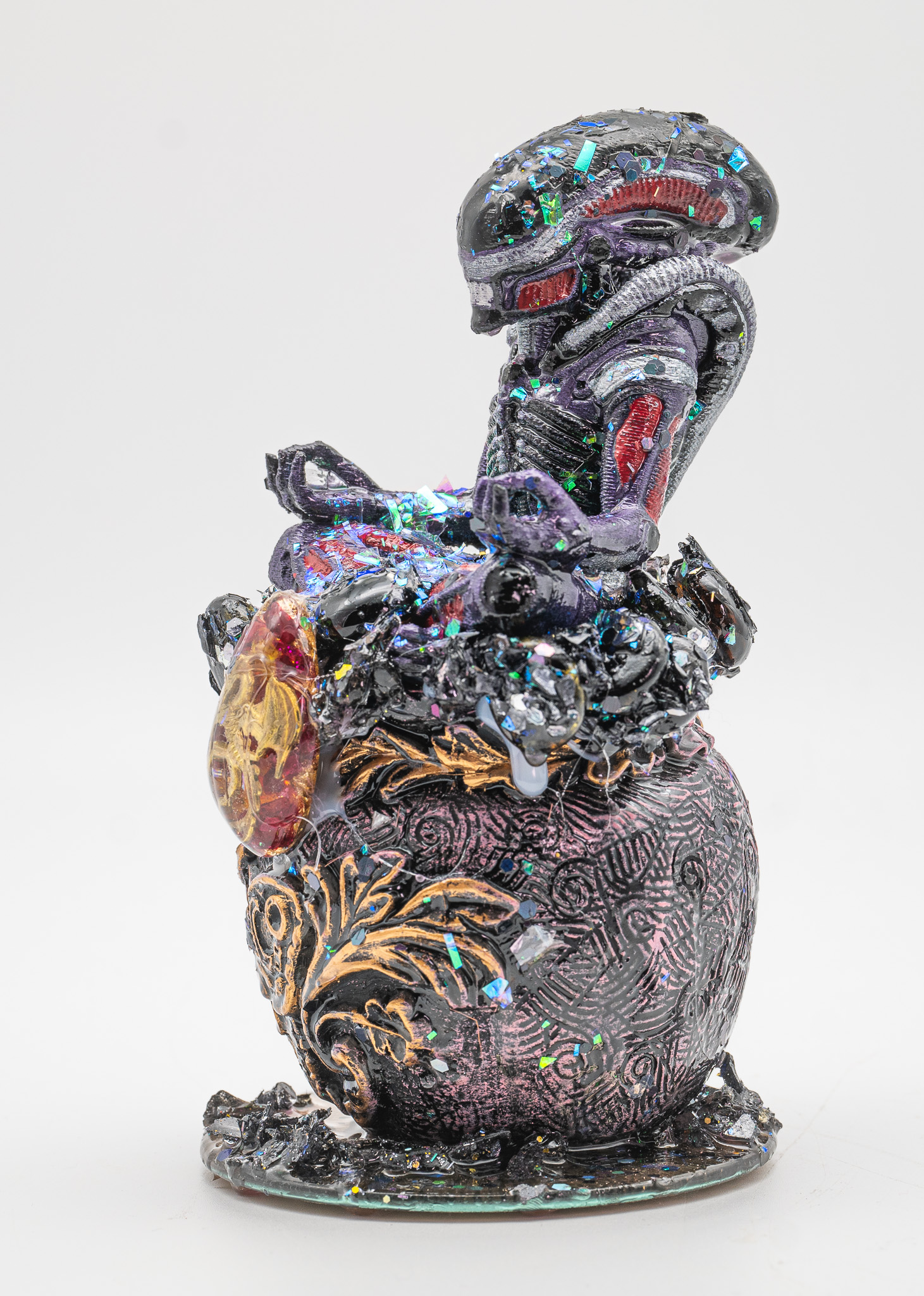 Die reflektierenden Einschlüsse sorgen für lebendige Lichtbrechungen. Je nach Blickwinkel verändert das Objekt seine Wirkung – mal düster, mal mystisch, mal majestätisch.