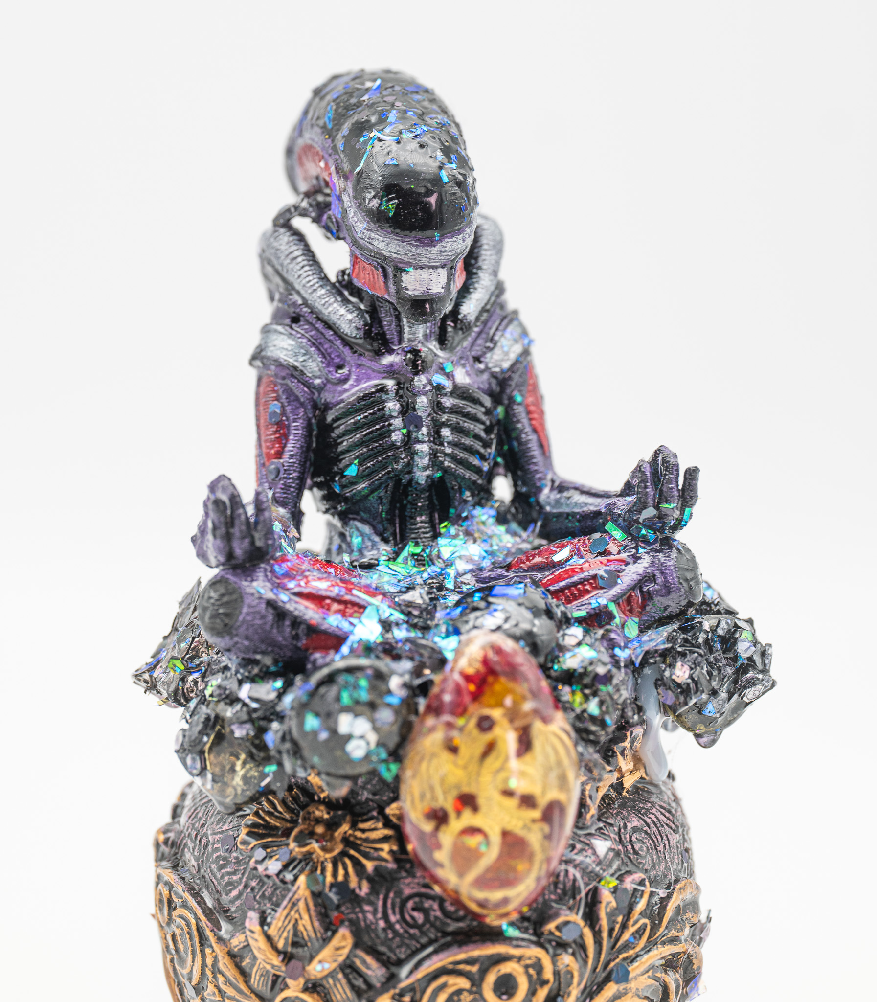 Die Figur sitzt kraftvoll auf einem ornamentierten Sockel, getragen von stabiler, archaischer Energie. Die Hände ruhen geöffnet auf den Knien – wie in Meditation. Der Brustkorb erscheint freigelegt, verletzlich – und dennoch unantastbar. Im Zentrum sitzt ein schimmernder Pranatropfen in warmem Gold-Rot, wie ein pulsierender Kern.